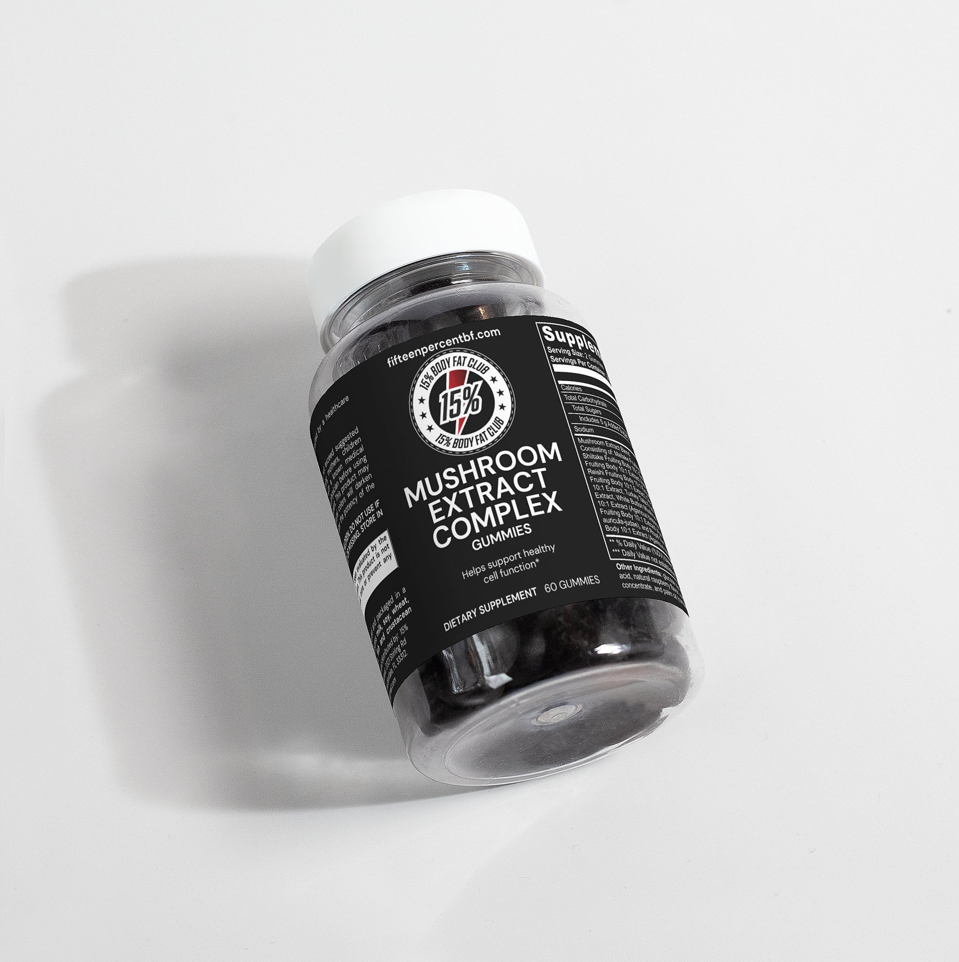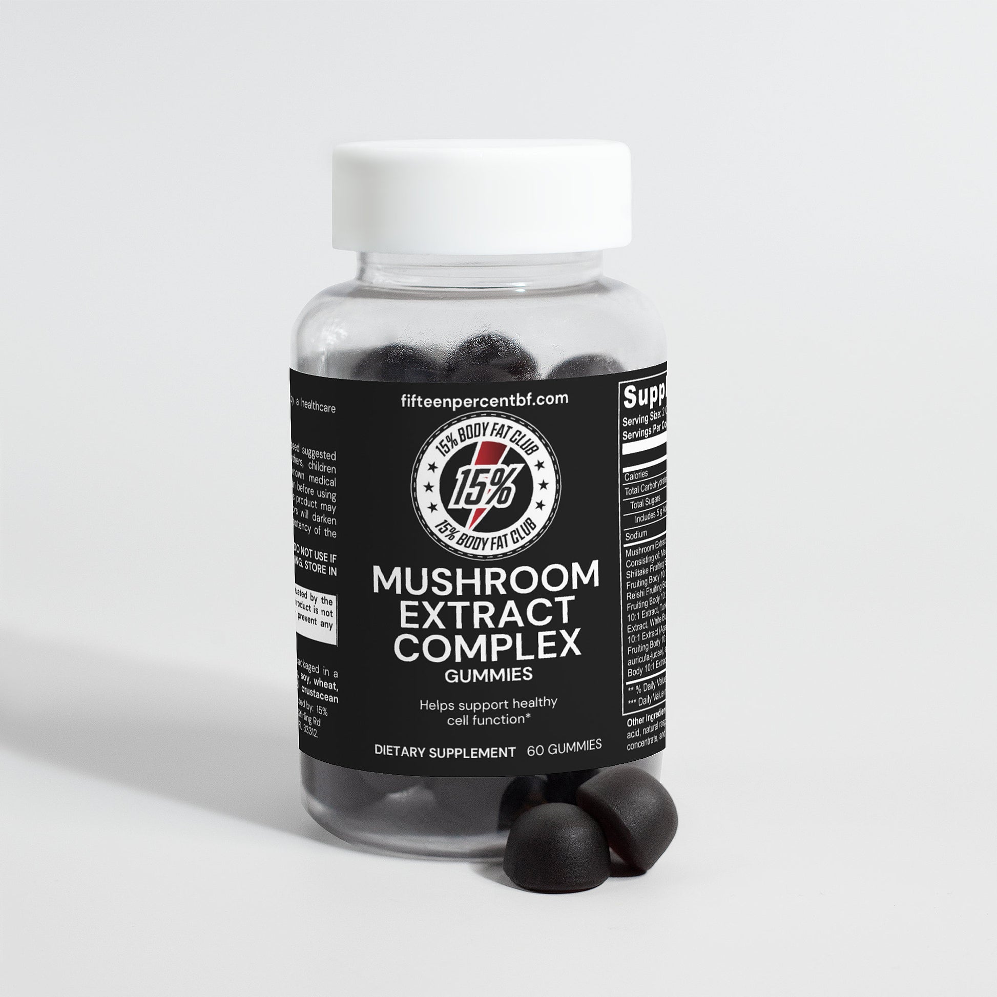 Ingrédients : Extrait de champignon (extrait de corps de fructification de Maitake 10:1, extrait de corps de fructification de Shiitake 10:1, extrait de corps de fructification de Crinière de Lion 10:1, extrait de corps de fructification de Reishi 10:1, extrait de corps de fructification de Cordyceps 10:1, extrait de corps de fructification de Chaga 10:1, extrait de corps de fructification de queue de dinde 10:1, extrait de corps de fructification de champignon de Paris blanc 10:1, extrait de corps de fructification de champignon noir 10:1, extrait de corps de fructification de champignon Royal Sun 10:1), sirop de glucose, sucre, dextrose, pectine, acide citrique, arôme naturel de framboise, citrate de sodium, concentré de jus de carotte violette, huile de palme (contient de la cire de carnauba).